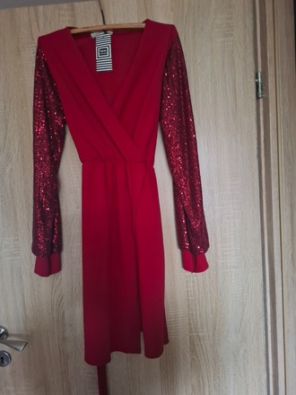 Pasijuskite vakaro žvaigžde su šia nuostabia, elegantiška suknele, puikiai tinkančia ypatingoms progoms. Gili V formos iškirptė ir dirželis ties liemeniu subtiliai pabrėžia figūros privalumus, o blizgiais žvyneliais puoštos rankovės leis pasijusti elegantiškai