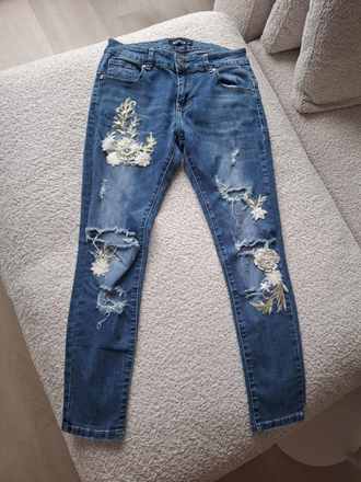 Plėšyti siaurėjantys džinsai su aplikacijomis