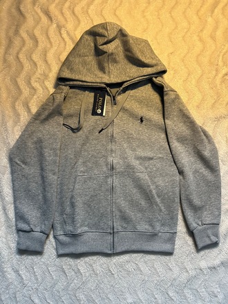 Naujas pilkas Ralph Lauren džemperis su užtrauktuku ir gobtuvu, su etiketėmis.