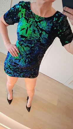 Nerealios kokybės suknelė: storas audinys (žvyneliai prisiūti ant velveto medžiagos, todėl suknelė nepersišviečia, o žvyneliai "nekanda" odos), standi medžiaga, dailus siluetas.